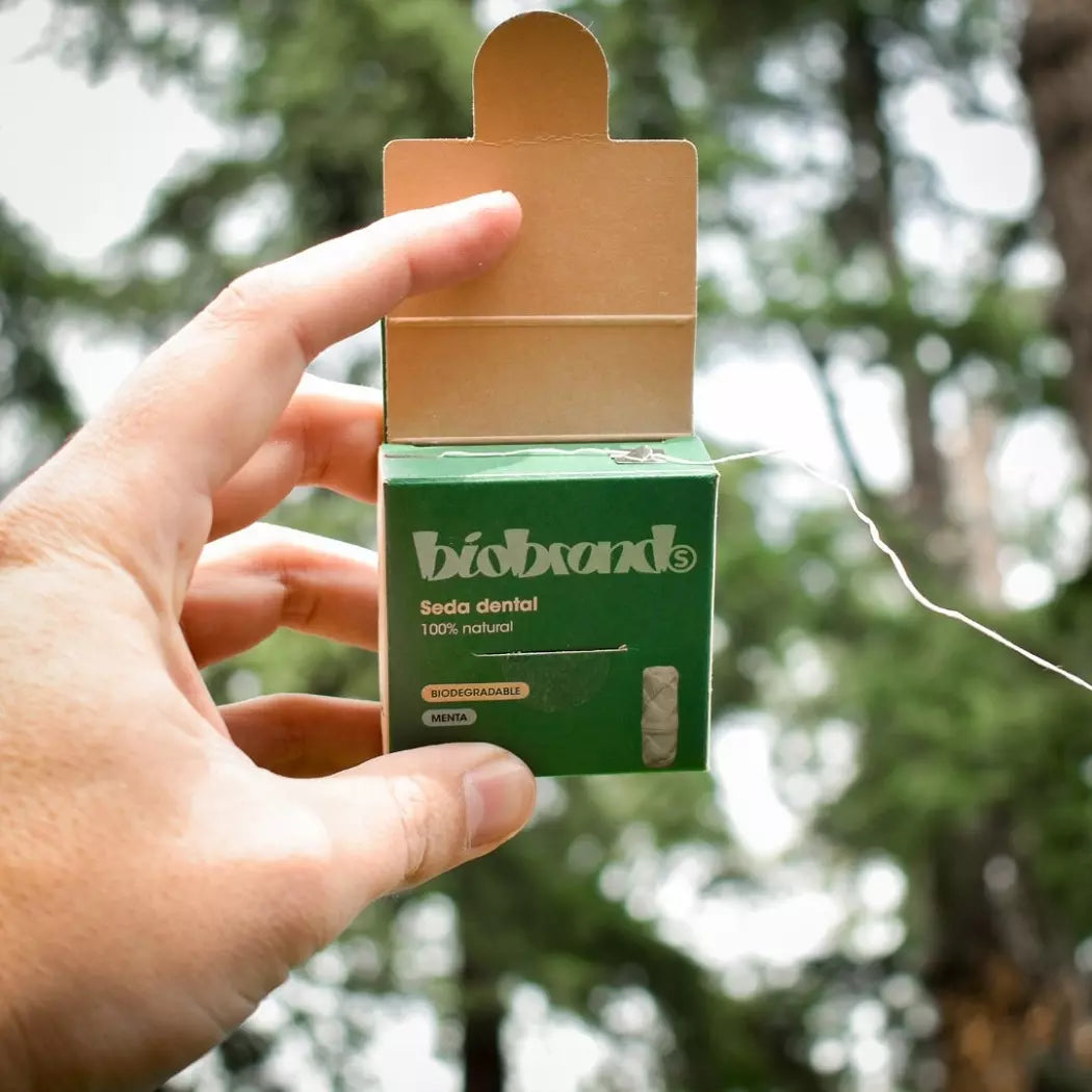 La seda dental Biofloss es compostable y biodegradable, elaborada con seda natural proveniente del gusano de la seda. Su composición 100% natural la convierte en una opción amigable con el medio ambiente. Biofloss no solo cuida de tus dientes, sino también del planeta.
