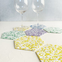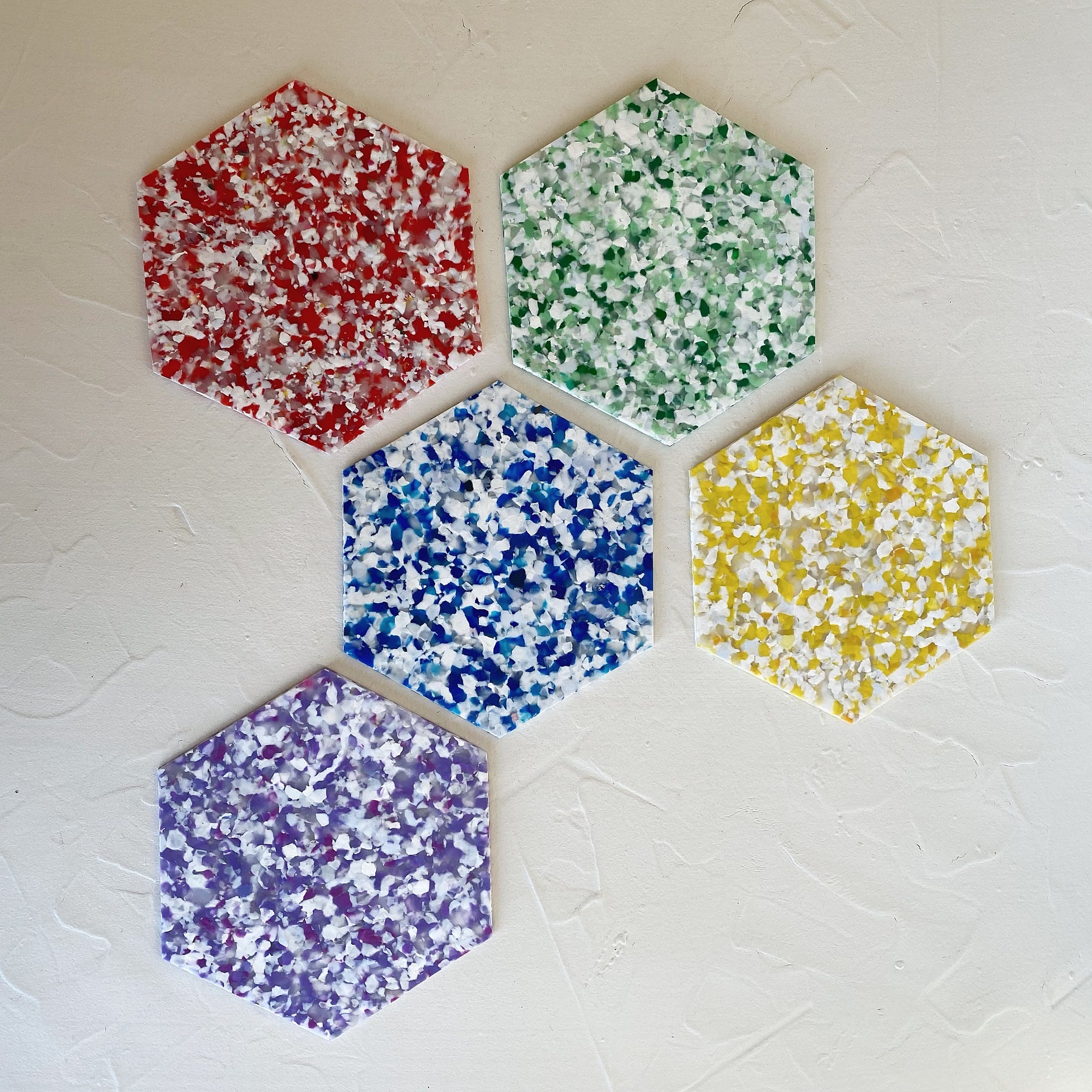 Set de 6 posavasos hexagonales de Taller Verde Sur. Una opción ecológica y sostenible para proteger tus superficies, fabricado con plástico 100% reciclado de la X Región.