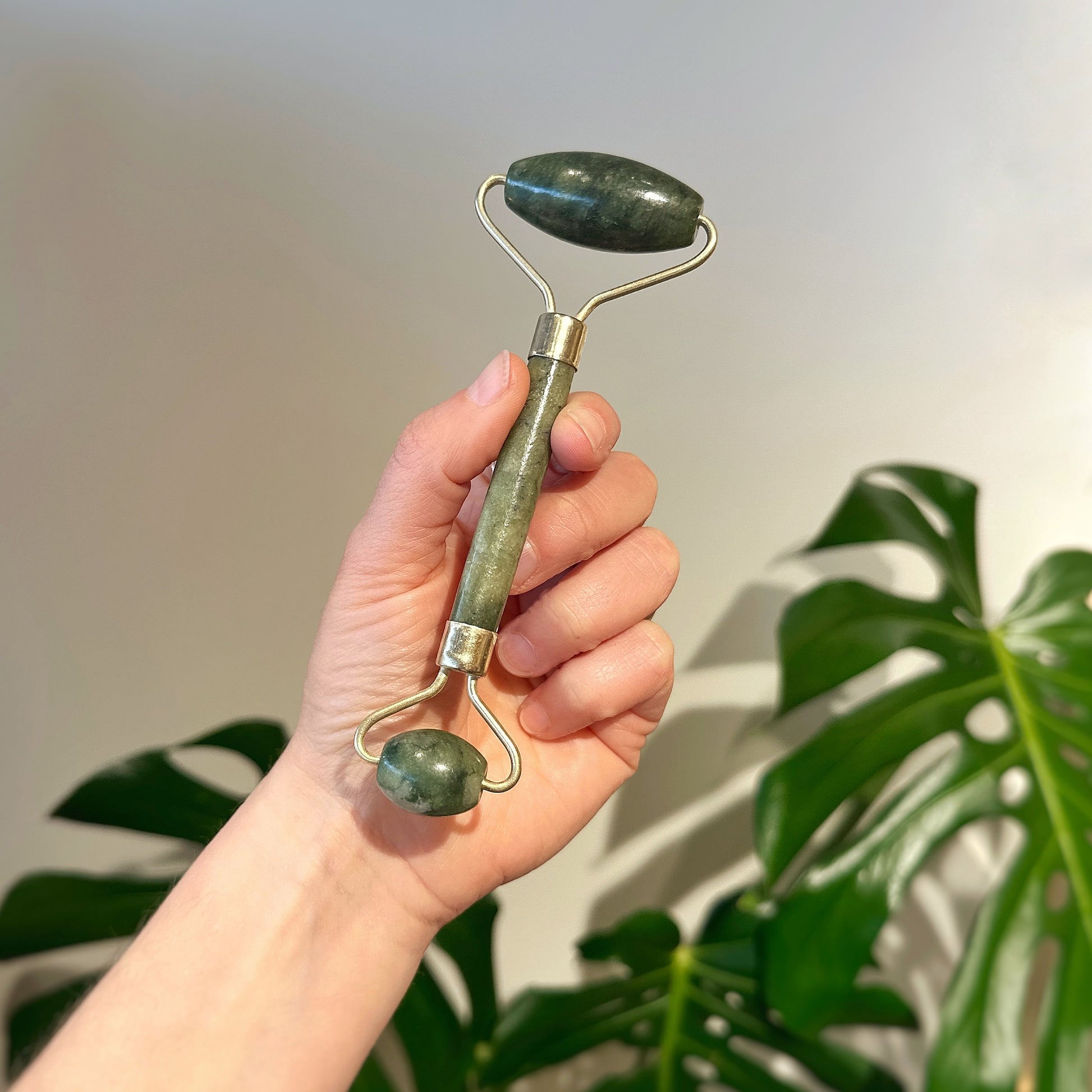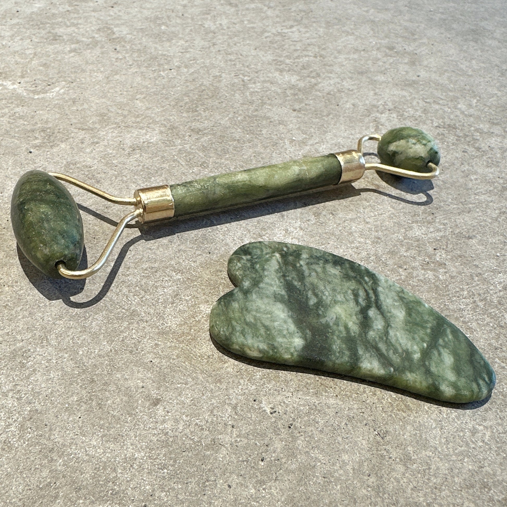 Set de rodillo facial y gua sha de jade natural. Perfecto para masajear el rostro, estimular la piel y promover momentos de autocuidado conscientes.